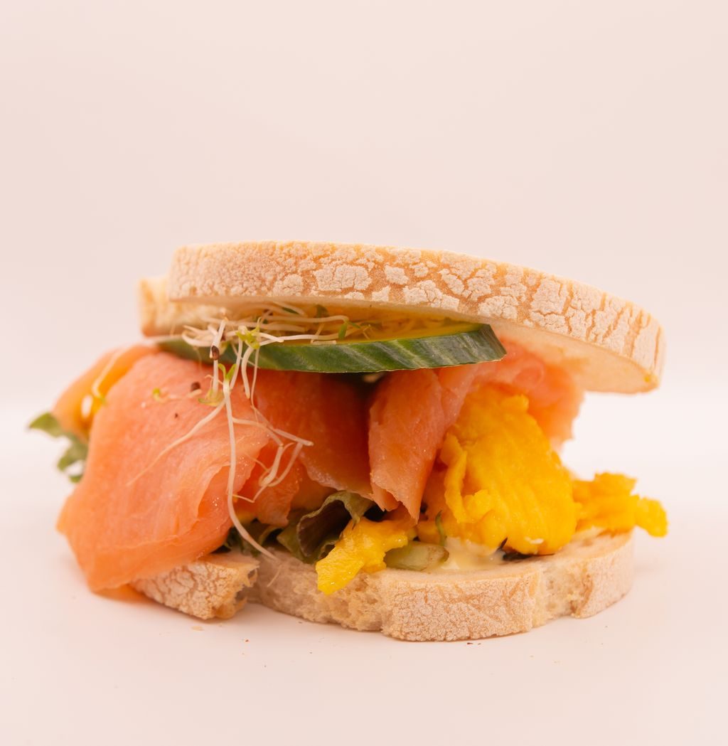 Glutenfritt landbrød/ grovbrød med røkt laks og eggerøre (uten melk)agurk, alfaspirer, salat.